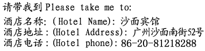 | Below is the address of Shamian Hotel with local phone number in Chinese. You could print it and show to the local taxi driver, which could be very useful to get to Shemian Hotel Guangzhou successfully! |